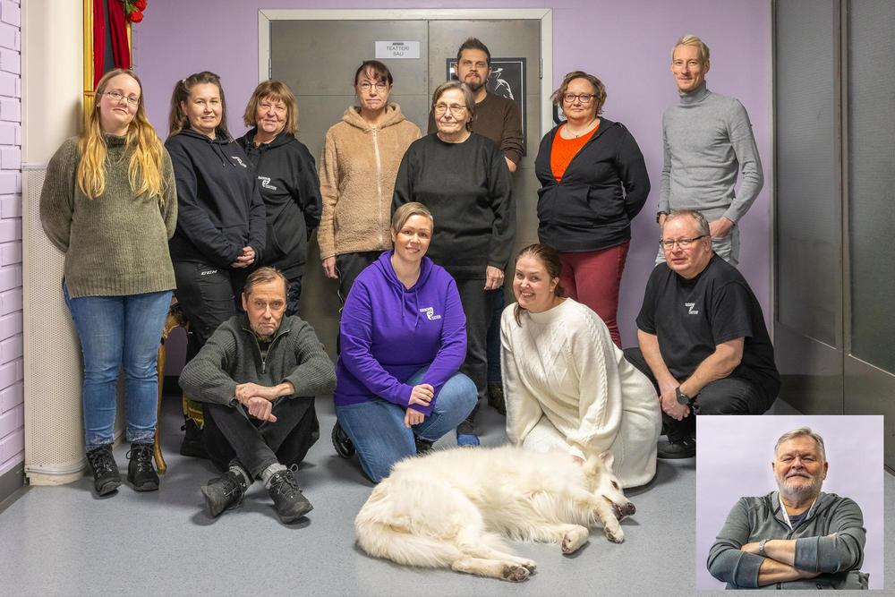 Alarivissä vasemmalta: Jouni Lehtonen, Minna Kimiläinen, Laura Hurme, Urpo Helenius ja Hannu Aali. Mukana myös teatterikoiramme Mauno. Kuva: Urpo Helenius